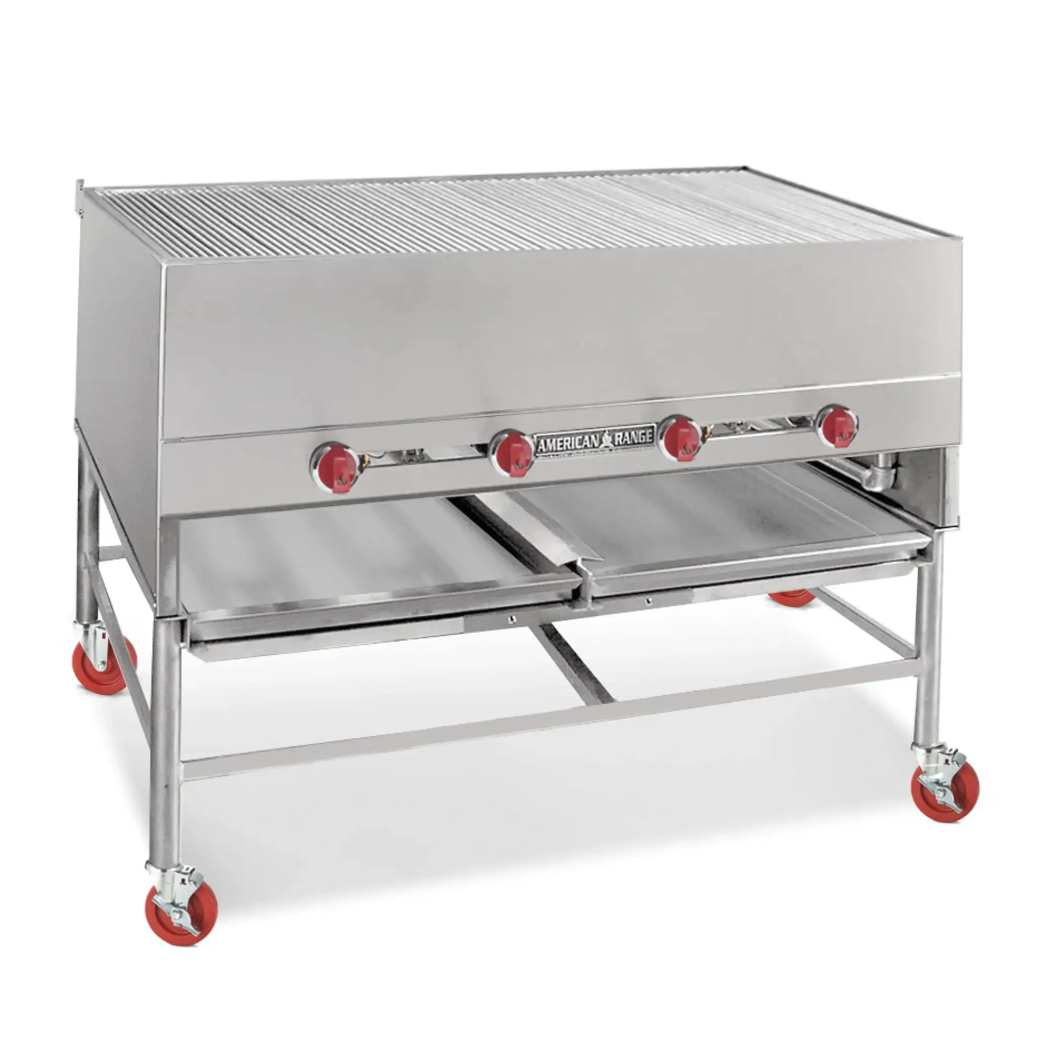 Precision tools for the culinary virtuoso, the American Range AHS-4836 Charbroiler is a must-have for any commercial restaurant. This gas-powered, floor model charbroiler is designed to deliver exceptional performance and durability. With a 48" wide cooking surface and four burners, it provides ample space to cook a variety of dishes simultaneously. The round rod non-stick top grates ensure even heat distribution and prevent food from sticking, while the open bottom grate design allows for easy cleaning. Made in the USA with a stainless steel exterior, this charbroiler is built to withstand the demands of a busy kitchen. With a powerful 47.0kW and 160,000 BTU, it delivers the heat needed to achieve perfect sear marks and delicious flavors.