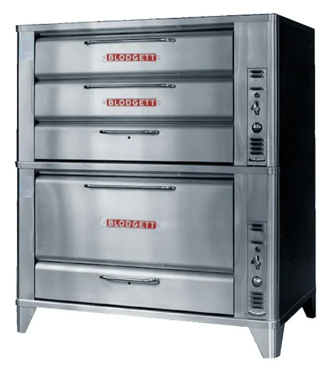 The Blodgett Deck Oven line has set industry wide standards for excellence in baking characteristics, performance and reliability. Simplicity of design and quality construction throughout assure years of trouble-free operation. Blodgett provides the strongest warranty in the business with a standard five-year door warranty! Creating endless possibilities with the Basic Four! The Blodgett large 900 Series gas deck ovens come in four basic sections. Each section has the same 60″ x 40″ footprint and can be stacked in any combination. The possibilities are endless. Separate heat controls for each section permit baking and roasting at different temperatures, simultaneously, in one oven! Blodgett’s Basic Four design gives you the ultimate in versatility, efficiency, and economy. 981-966 is a 981 oven stacked on a 966 oven with a total of two 7” and one 16.25” high baking compartment and includes 7” s/s adjustable legs, stainless steel draft diverter or direct vent, crown angle trim and double gas connector