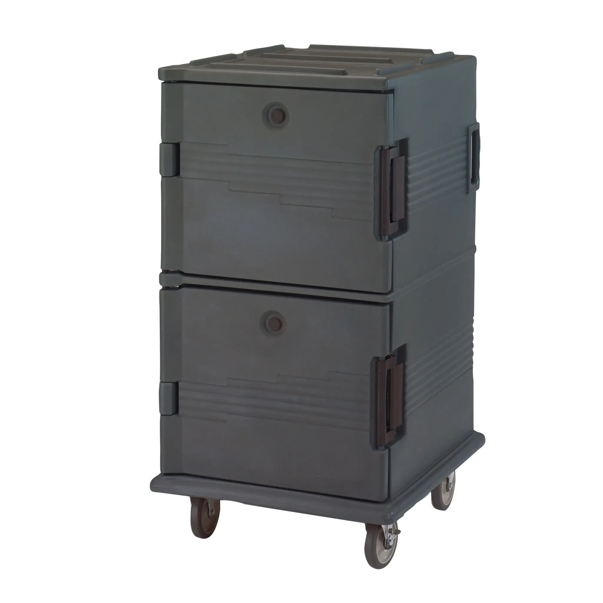 Seamless solutions for food optimization. Introducing the Cambro UPC1600SP110 Cabinet, Enclosed, Bun/Food Pan. This versatile and durable food pan carrier is designed to meet the demands of commercial restaurants. With its one-piece double wall polyethylene shell and foam insulation, it ensures optimal temperature retention for your food. The carrier can hold up to 24 full-size pans, allowing you to transport a large quantity of food at once. The tamper-resistant security package provides peace of mind, while the molded-in handles and bumpers make it easy to maneuver. The air-tight gasket and vent cap maintain the freshness of your food during transportation. Equipped with heavy-duty casters, including two fixed and two swivel with brakes, this carrier is easy to move around your kitchen or dining area. Trust Cambro for reliable and efficient food transportation solutions.