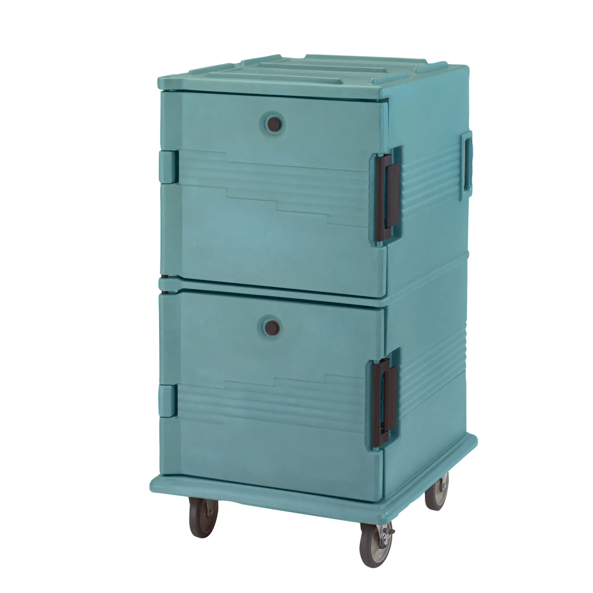 Transform kitchen service with the Cambro UPC1600SP401 Cabinet, Enclosed, Bun/Food Pan. This innovative solution from Cambro is designed to revolutionize commercial restaurant operations. With its one-piece double wall polyethylene shell and foam insulation, this Ultra Camcart Food Pan Carrier ensures optimal temperature retention for your food. It can hold up to 24 full-size pans, making it perfect for high-volume establishments. The security package includes a tamper-resistant nylon latch and an air-tight gasket, guaranteeing the safety and freshness of your culinary creations. The molded-in handles and bumpers provide easy maneuverability and protection during transport. Equipped with heavy-duty casters, including two fixed and two swivel with brakes, this carrier can effortlessly navigate any kitchen. The slate blue color adds a touch of elegance to your restaurant's aesthetic. NSF-approved, this Cambro cabinet is a must-have for any commercial kitchen looking to enhance efficiency and maintain food quality.