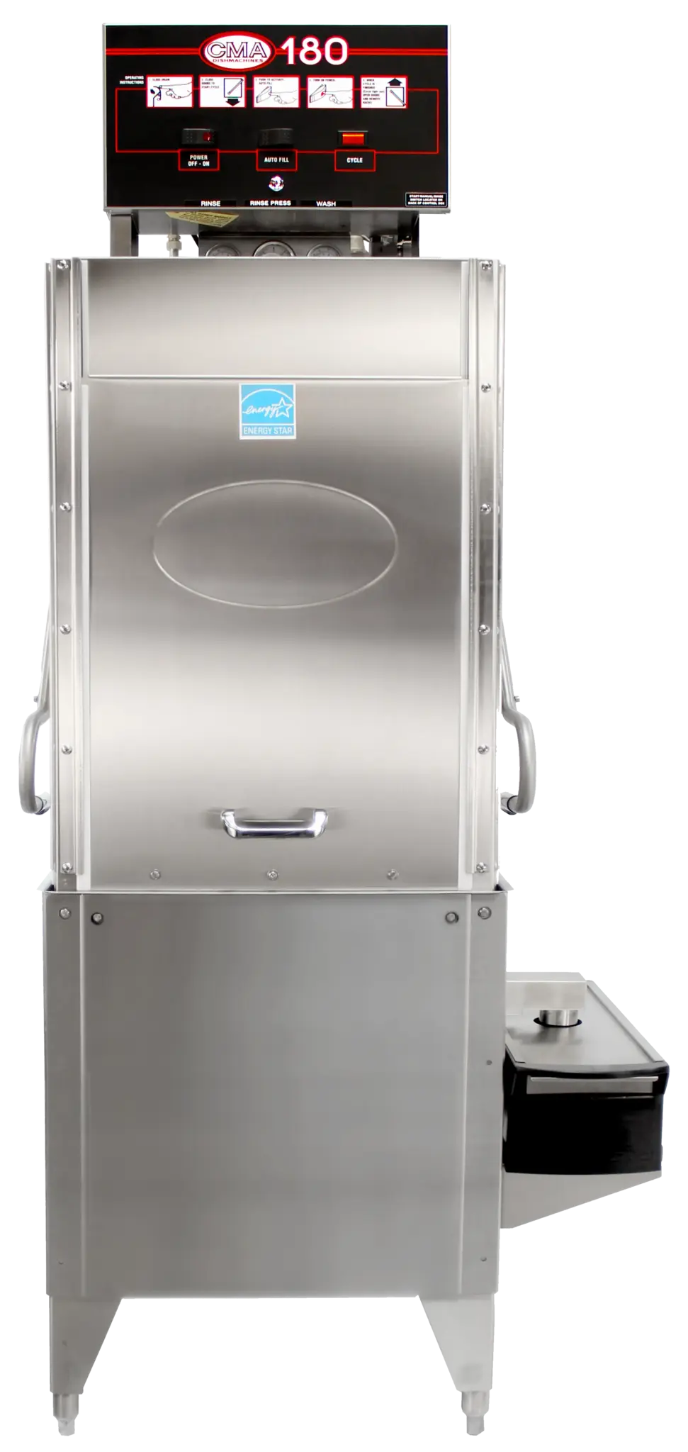Achieve kitchen supremacy with the CMA Dishmachines, 180TallSB, Dishwasher, Door Type. This pot and pan dishwasher is designed to meet the demands of a busy commercial restaurant. With its high temperature sanitizing feature and built-in booster heater, it ensures that your dishes are thoroughly cleaned and sanitized. The straight-thru design and split-door feature provide ample dish clearance, making it easy to load and unload dishes. The automatic soil purging system and external Poly Pro scrap accumulator help to keep the dishwasher clean and free from debris. The interchangeable wash arms with a pull-pin design allow for easy maintenance and customization. Safety is also a priority with the Safety-Temp feature, ensuring that the water temperature is always at the optimal level. Made with stainless steel construction and a 1 HP wash pump, this dishwasher is built to last. NSF, UL, cULus, and ENERGY STAR certified, it meets the highest standards of quality and efficiency. Upgrade your restaurant's dishwashing capabilities with the CMA Dishmachines, 180TallSB, Dishwasher, Door Type.