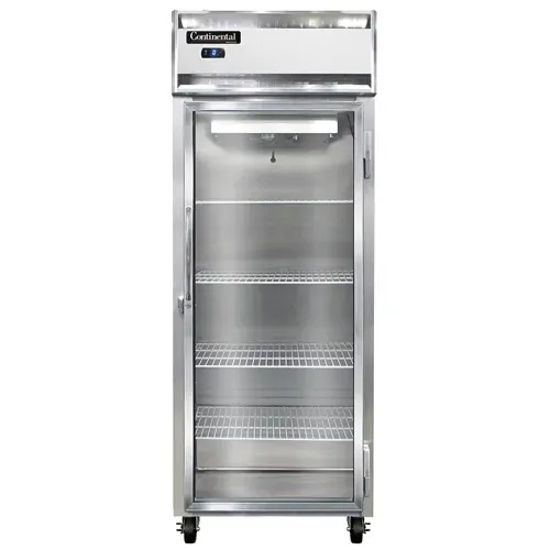 Experience kitchen innovation with the Continental Refrigerator, 1FENSSGD, Freezer, Reach-In. This extra-wide, one-section freezer is designed to meet the demands of a commercial restaurant. With its stainless steel exterior and interior, it not only looks sleek but also ensures durability and easy cleaning. The full-height glass door allows for easy visibility of the contents, making it convenient for chefs to quickly locate items. The electronic control with a digital display provides precise temperature management, while the hi-low alarm alerts staff if the temperature goes outside the desired range. The electric condensate evaporator eliminates the need for manual defrosting, saving time and effort. Made in the USA and certified by cETLus and NSF, this freezer guarantees quality and safety. Upgrade your restaurant's storage capabilities with the Continental Refrigerator, 1FENSSGD, Freezer, Reach-In.