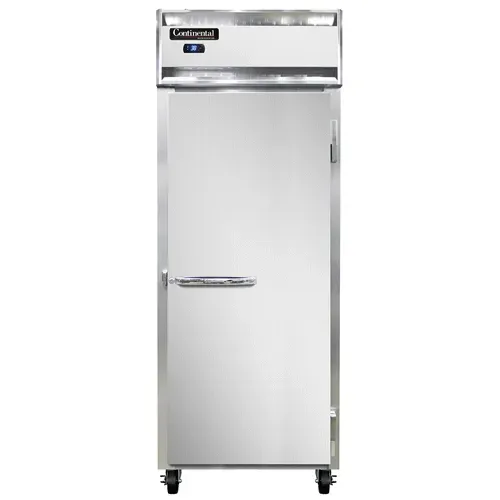 Discover kitchen perfection with the Continental Refrigerator, 1RESN, Refrigerator, Reach-In. This extra-wide, one-section refrigerator is designed to meet the needs of commercial restaurants. With its shallow depth and full-height solid door, it provides ample storage space while saving valuable kitchen space. The stainless steel front and aluminum interior and ends ensure durability and easy cleaning, making it ideal for busy restaurant environments. The electronic control with a digital display allows for precise temperature management, while the hi-low alarm alerts staff if the temperature goes outside the desired range. With a 1/4 HP self-contained refrigeration system, this reach-in refrigerator is energy-efficient and reliable. Made in the USA and certified by cETLus and NSF, you can trust the quality and safety of this Continental Refrigerator. Upgrade your restaurant kitchen with the Continental Refrigerator, 1RESN, Refrigerator, Reach-In.