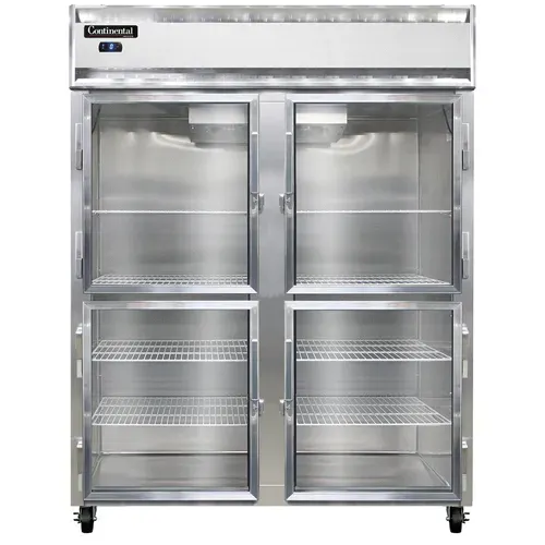 Unleash gastronomic brilliance with the Continental Refrigerator 2FENSSGDHD Freezer, Reach-In. This extra-wide freezer is designed to meet the demands of a busy commercial restaurant. With a spacious 50 cu. ft. capacity and two sections, it provides ample storage space for all your frozen ingredients and prepared dishes. The four hinged self-closing glass doors, with their half-height design, allow for easy access and visibility of the contents. Inside, you'll find eight epoxy coated steel shelves that can be adjusted to accommodate items of various sizes. The stainless steel exterior and interior not only give the freezer a sleek and professional look but also make it durable and easy to clean. Equipped with electronic control and a digital display, you can easily monitor and adjust the temperature to ensure optimal food preservation. The hi-low alarm alerts you if the temperature deviates from the set range, allowing you to take immediate action. Made in the USA and certified by cETLus and NSF, this Continental Refrigerator freezer is a reliable and high-quality addition to any commercial kitchen.