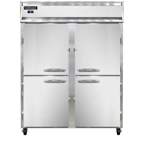 Revolutionize your cooking setup with the Continental Refrigerator, 2RENHD, Refrigerator, Reach-In. This extra-wide, two-section refrigerator is designed to meet the demands of a busy commercial restaurant. With a spacious 57"W interior, you'll have plenty of room to store all your perishable ingredients and keep them fresh. The stainless steel front and aluminum interior and ends not only provide durability but also give the refrigerator a sleek and professional look. The half-height solid doors offer easy access to your stored items, while the electronic control with a digital display allows you to easily monitor and adjust the temperature. Plus, the hi-low alarm ensures that you are immediately alerted if the temperature goes outside the desired range. Made in the USA and certified by cETLus and NSF, this Continental Refrigerator is a reliable and high-quality choice for any commercial kitchen. Upgrade your restaurant's refrigeration capabilities with this top-of-the-line reach-in refrigerator.