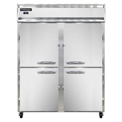 Master your restaurant's kitchen with the Continental Refrigerator 2RENSAHD Reach-In Refrigerator. This extra-wide, two-section refrigerator is designed to meet the demands of a busy commercial kitchen. With a spacious 57" width and half-height solid doors, it provides easy access to your ingredients and supplies. The stainless steel exterior and aluminum interior ensure durability and easy cleaning, while the standard depth allows for optimal storage capacity. The electronic control with a digital display and hi-low alarm ensures precise temperature control and alerts you to any fluctuations. The electric condensate evaporator eliminates the need for manual defrosting, saving you time and effort. Powered by a 1/3 HP compressor, this refrigerator is energy-efficient and reliable. Made in the USA and certified by cETLus and NSF, you can trust the quality and safety of this Continental Refrigerator. Upgrade your kitchen with the 2RENSAHD Reach-In Refrigerator and experience enhanced efficiency and organization.
