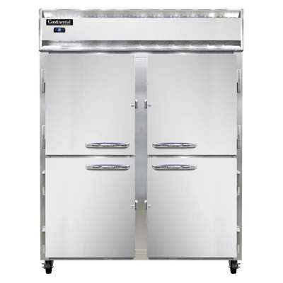 Introducing the Continental Refrigerator, 2RESNSAHD, Refrigerator, Reach-In - the perfect solution to simplify restaurant operations. This extra-wide, two-section reach-in refrigerator is designed to meet the demands of a busy commercial kitchen. With its shallow depth and half-height solid doors, it maximizes space efficiency while providing easy access to stored items. The stainless steel exterior and aluminum interior ensure durability and easy cleaning, while the self-contained refrigeration system guarantees optimal temperature control. The electronic control with a digital display allows for precise adjustments, and the hi-low alarm ensures food safety. Powered by a 1/3 HP motor, this refrigerator is both energy-efficient and reliable. Made in the USA and certified by cETLus and NSF, you can trust its quality and performance. Upgrade your restaurant with the Continental Refrigerator, 2RESNSAHD, and experience the convenience and efficiency it brings to your kitchen.