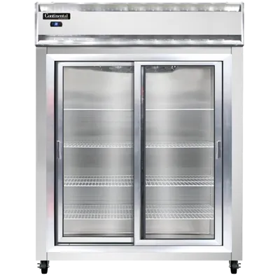 Unleash gastronomic brilliance with the Continental Refrigerator, 2RESNSSSGD. This extra-wide reach-in refrigerator is designed to meet the demanding needs of commercial restaurants. With a spacious 57"W two-section design, it provides ample storage space for all your perishable ingredients. The shallow depth allows for easy access and efficient organization of your food items. The full-height sliding glass doors not only provide a clear view of the contents but also add a touch of elegance to your kitchen. The stainless steel exterior and interior ensure durability and easy cleaning, while the self-contained refrigeration system guarantees optimal temperature control. The electronic control with a digital display allows for precise adjustments, and the hi-low alarm ensures that you are promptly alerted to any temperature fluctuations. With a powerful 1/2 HP motor, this refrigerator is built to handle the demands of a busy restaurant kitchen. Trust in the Continental Refrigerator, 2RESNSSSGD, to keep your ingredients fresh and your kitchen running smoothly. Made in the USA, this refrigerator is cETLus and NSF certified, ensuring its quality and reliability.
