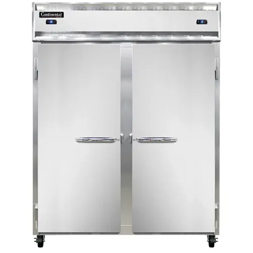 Enhance your commercial kitchen with the Continental Refrigerator 2RFENSS Reach-In Refrigerator Freezer. This extra-wide, two-section unit is designed to meet the demands of a busy restaurant environment. With a spacious 57" width and full-height solid doors, you'll have ample storage space for all your perishable items. The stainless steel exterior and interior not only provide durability but also make cleaning a breeze. The self-contained refrigeration system ensures consistent temperature control, while the electronic control with a digital display allows for easy monitoring and adjustment. The hi-low alarm alerts you if the temperature deviates from the set range, ensuring the safety of your food. The electric condensate evaporator eliminates the need for manual defrosting, saving you time and effort. Powered by dual 1/4 & 1/3 HP compressors, this refrigerator freezer delivers reliable performance. Upgrade your kitchen with the Continental Refrigerator 2RFENSS and experience the convenience and efficiency it brings to your commercial restaurant.