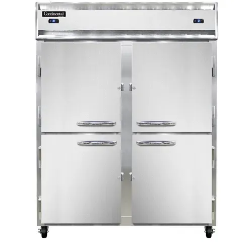 Transform your food service with the Continental Refrigerator 2RFENSSHD Reach-In Refrigerator Freezer. This extra-wide, two-section unit is designed to meet the demands of a busy commercial restaurant. With its stainless steel exterior and interior, it not only looks sleek but also ensures durability and easy cleaning. The four half-height solid self-closing doors provide convenient access to the refrigerator and freezer compartments. The electronic control with a digital display allows for precise temperature management, while the hi-low alarm alerts you to any fluctuations. The LED interior lighting illuminates the contents, making it easy to find what you need. With six epoxy-coated steel shelves, you have ample storage space for your ingredients. The electric condensate evaporator ensures efficient operation, and the dual 1/4 & 1/3 HP compressor provides reliable cooling power. Made in the USA and certified by cETLus and NSF, this Continental Refrigerator is a top choice for any commercial kitchen.