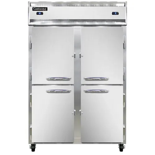 Introducing the Continental Refrigerator, 2RFNHD, Refrigerator Freezer, Reach-In. Dominate the culinary world with this top-of-the-line commercial refrigerator and freezer. Designed by Continental Refrigerator, a trusted name in the industry, this model is perfect for restaurants looking to optimize their storage space and maintain the freshness of their ingredients. With a spacious 52"W two-section design, this self-contained refrigeration unit offers ample room for all your perishables. The stainless steel front and aluminum interior ensure durability and easy cleaning, while the four half-height solid self-closing doors provide convenient access. The electronic control with a digital display allows for precise temperature management, and the hi-low alarm system ensures food safety. The LED interior lighting illuminates the contents, making it easy to find what you need. With six epoxy-coated steel shelves and a dual 1/4 & 1/3 HP electric condensate evaporator, this refrigerator freezer is a reliable and efficient addition to any commercial kitchen. Trust Continental Refrigerator to deliver quality and performance. Made in the USA, cETLus and NSF certified.