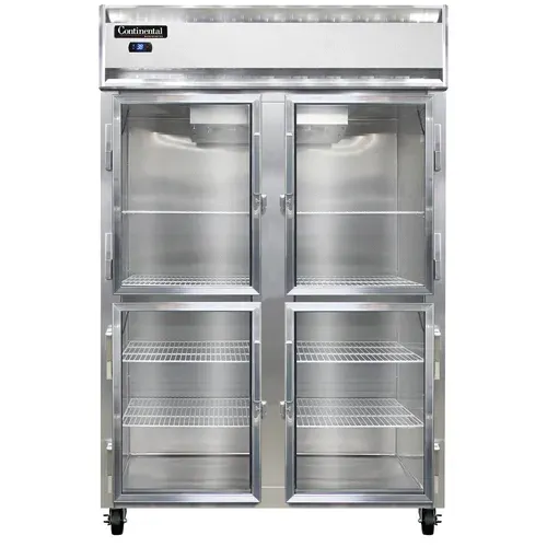 Invest in superior quality with the Continental Refrigerator, 2RNSGDHD, Refrigerator, Reach-In. This two-section reach-in display refrigerator is designed to meet the demands of a commercial restaurant. With its self-contained refrigeration system and electronic control with a digital display, you can easily monitor and adjust the temperature to ensure your ingredients stay fresh. The narrow sliding glass half doors provide easy access to your products while minimizing the amount of cold air that escapes. The aluminum exterior and interior, along with the stainless steel front, not only give this refrigerator a sleek and professional look but also make it durable and easy to clean. The hi-low alarm alerts you if the temperature goes outside the desired range, ensuring the safety of your food. Made in the USA and certified by cETLus and NSF, this Continental Refrigerator is a reliable and efficient choice for any commercial kitchen.