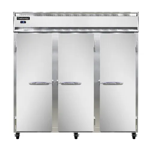 Craft culinary wonders with the Continental Refrigerator, 3FSN, Freezer, Reach-In. This self-contained refrigeration unit is designed to meet the demands of a busy commercial restaurant. With its shallow depth and full-height solid doors, it provides ample storage space while maximizing efficiency in the kitchen. The stainless steel front and aluminum interior and ends ensure durability and easy cleaning, while the electronic control with a digital display allows for precise temperature management. The hi-low alarm feature alerts you if the temperature goes outside the desired range, ensuring the safety of your perishable ingredients. Powered by a 3/4 HP motor, this freezer is capable of handling the demands of a bustling kitchen. Made in the USA and certified by cETLus and NSF, you can trust the quality and reliability of this Continental Refrigerator. Upgrade your restaurant's storage capabilities with the 3FSN Freezer, Reach-In.