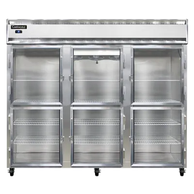 Deliver food perfection with the Continental Refrigerator, 3RENSAGDHD, Reach-In Refrigerator. This extra-wide, three-section refrigerator is designed to meet the demands of a busy commercial restaurant. With its self-contained refrigeration system, stainless steel exterior, and aluminum interior, this refrigerator is built to last and withstand the rigors of a professional kitchen. The wide half-height glass doors not only provide easy access to your ingredients but also allow you to showcase your culinary creations to customers. The electronic control with a digital display ensures precise temperature control, while the hi-low alarm alerts you if the temperature deviates from the set range. The electric condensate evaporator eliminates the need for manual defrosting, saving you time and effort. With a powerful 3/4 HP compressor, this refrigerator can handle the demands of a busy kitchen. Trust Continental Refrigerator, a reputable brand known for its quality and reliability. Made in the USA, this reach-in refrigerator is cETLus and NSF certified, guaranteeing its safety and compliance with industry standards. Upgrade your restaurant's refrigeration system with the Continental Refrigerator, 3RENSAGDHD, Reach-In Refrigerator.