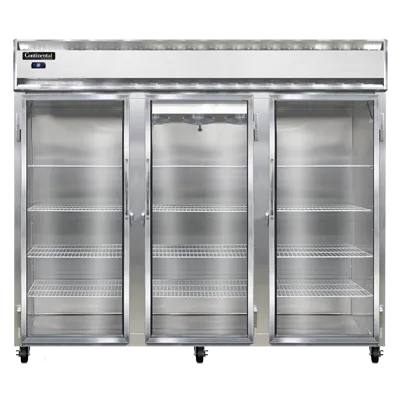 Master your restaurant's kitchen with the Continental Refrigerator, 3RENSSGD, Reach-In Refrigerator. This extra-wide, three-section refrigerator is designed to meet the demands of a busy commercial restaurant. With a spacious 85-1/2" width and full-height glass doors, you can easily store and display a large quantity of food items for quick access. The stainless steel exterior and interior ensure durability and easy cleaning, while the standard depth provides ample storage space without taking up too much floor space. The electronic control with a digital display allows for precise temperature management, and the hi-low alarm alerts you if the temperature goes outside the desired range. The electric condensate evaporator eliminates the need for manual defrosting, saving you time and effort. With a powerful 3/4 HP compressor, this reach-in refrigerator is built to handle the demands of a commercial kitchen. Trust Continental Refrigerator for reliable, NSF-certified equipment that is proudly made in the USA.