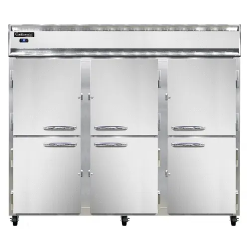 Maximize your food service potential with the Continental Refrigerator, 3RENSSPTHD, Refrigerator, Pass-Thru. This extra-wide, three-section refrigerator is designed to meet the demands of a busy commercial restaurant. With its stainless steel exterior and interior, it not only looks sleek but also ensures durability and easy cleaning. The half-height solid doors provide convenient access to the contents while maintaining temperature control. The electronic control with a digital display allows for precise temperature management, while the hi-low alarm alerts you if the temperature goes outside the desired range. The self-contained refrigeration system and electric condensate evaporator ensure efficient cooling and minimal maintenance. With a width of 85-1/2", this pass-thru refrigerator offers ample storage space for your ingredients and prepared dishes. Trust Continental Refrigerator to deliver a reliable and high-performing refrigeration solution for your commercial kitchen.