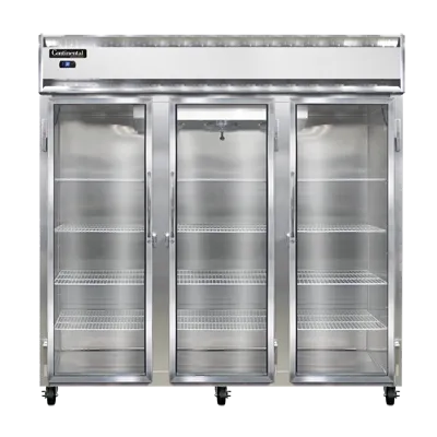 Experience kitchen innovation with the Continental Refrigerator, 3RNSAGD, Refrigerator, Reach-In. This three-section reach-in display refrigerator is designed to meet the needs of commercial restaurants. With its stainless steel exterior and aluminum interior, it not only looks sleek but also ensures durability and easy cleaning. The narrow hinged glass doors provide a clear view of the contents, allowing for easy organization and quick access to ingredients. The electronic control with a digital display allows for precise temperature management, while the hi-low alarm ensures food safety. The electric condensate evaporator eliminates the need for manual defrosting, saving time and effort. With a powerful 3/4 HP compressor, this refrigerator provides efficient cooling for your perishable items. Made in the USA and certified by cETLus and NSF, you can trust the quality and reliability of this Continental Refrigerator. Upgrade your kitchen with this top-of-the-line reach-in refrigerator and experience the difference it makes in your restaurant's efficiency and productivity.