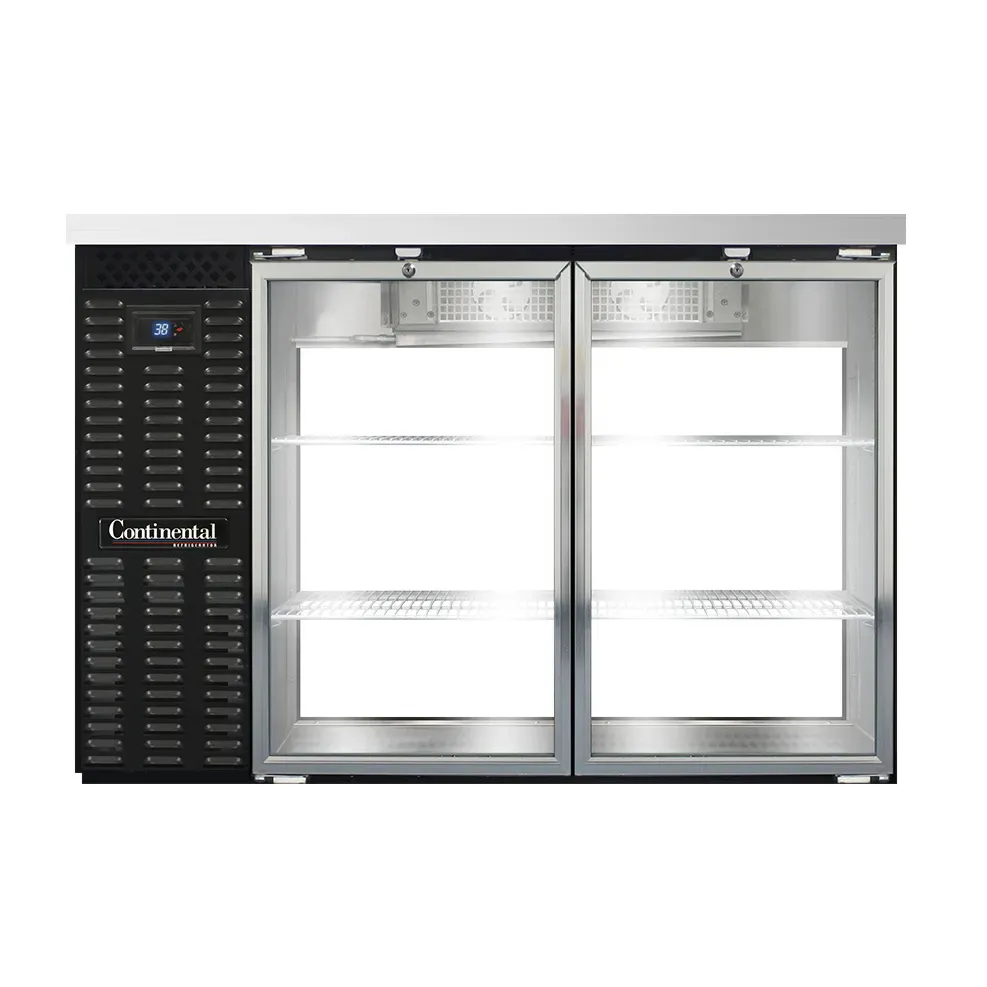 Enhance the heart of your restaurant with the Continental Refrigerator BB50NSGDPT Back Bar Cabinet. This refrigerated pass-thru unit is designed to meet the demands of a busy commercial restaurant. With a spacious 16.0 cubic feet capacity, it provides ample storage space for your beverages and ingredients. The front breathing feature allows for easy installation, while the sliding glass doors provide convenient access to your products. The electronic controller with a digital display and hi-low alarm ensures precise temperature control and alerts you if there are any fluctuations. The black enamel finish exterior adds a sleek and professional look to your establishment, while the galvanized interior with a reinforced stainless steel floor ensures durability and easy cleaning. The epoxy coated steel shelves provide sturdy support for your items. Made in the USA and certified by cETLus and NSF, this back bar cabinet is a reliable and high-quality addition to your restaurant.