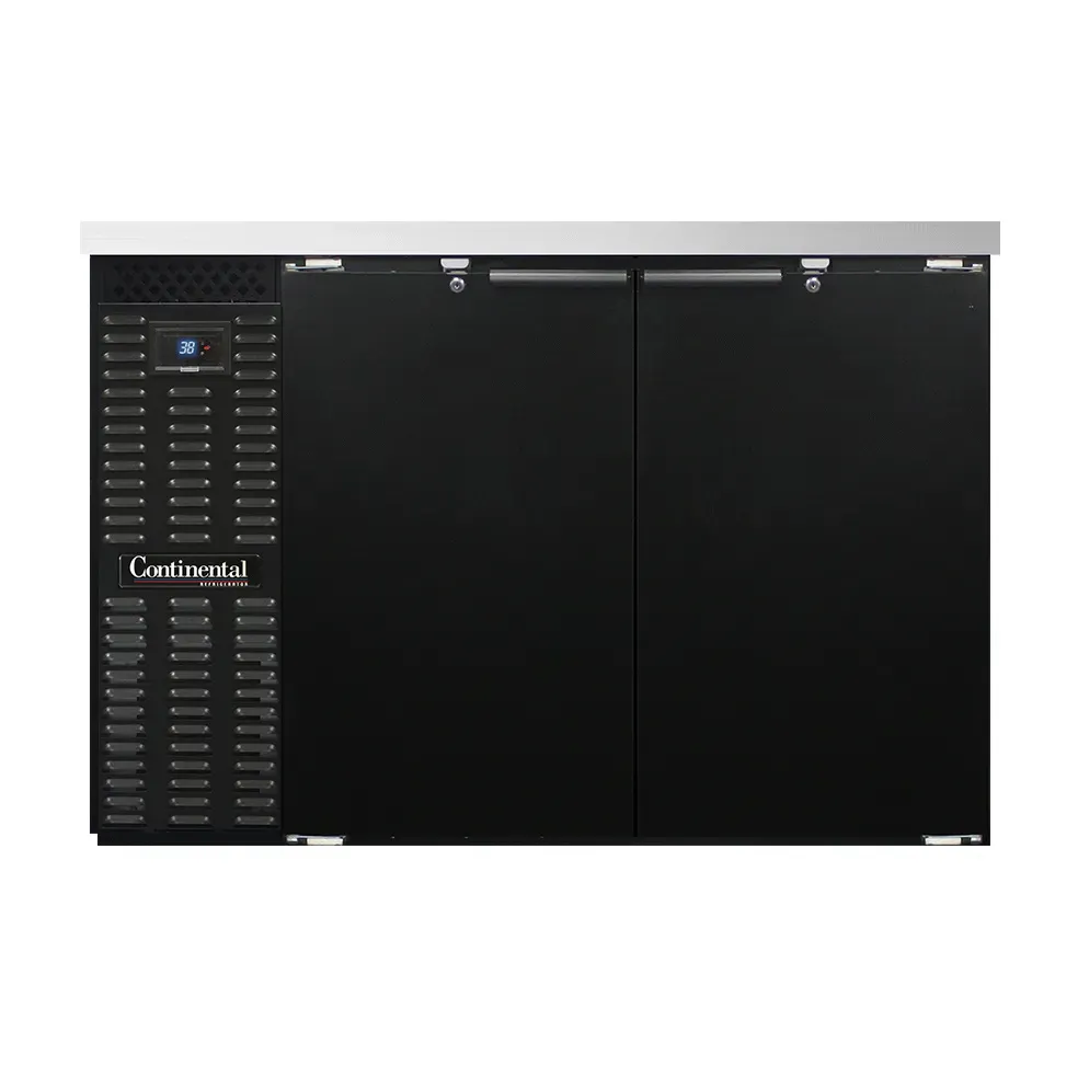 Optimize your kitchen efficiency with the Continental Refrigerator BB50SN Back Bar Cabinet. This refrigerated unit is designed to meet the demands of a commercial restaurant, offering a shallow depth of 50"W and 34-3/4"H, making it perfect for tight spaces. The stainless steel top provides durability and a sleek appearance, while the black enamel finish exterior adds a touch of elegance. With two doors that come with locks, you can securely store your beverages and ingredients. The electronic controller with a digital display and hi-low alarm ensures precise temperature control and alerts you if there are any fluctuations. Inside, the galvanized interior with a reinforced stainless steel floor and epoxy coated steel shelves provide easy cleaning and organization. Made in the USA and certified by cETLus and NSF, this back bar cabinet is a reliable and efficient addition to any commercial kitchen.