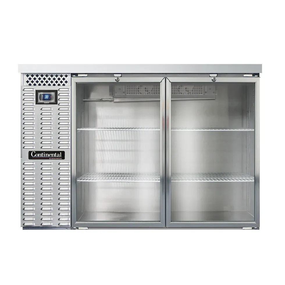 Achieve culinary excellence with the Continental Refrigerator BB50SNSGD Back Bar Cabinet. This refrigerated unit is designed to meet the needs of commercial restaurants, offering a shallow depth of 50"W and 34-3/4"H, making it perfect for tight spaces. With a capacity of 13.0 cubic feet, this back bar cooler provides ample storage for beverages and ingredients. The front breathing design allows for easy installation, while the sliding glass doors provide visibility and accessibility to the contents inside. The electronic controller with a digital display and hi-low alarm ensures precise temperature control and alerts you if there are any fluctuations. The black enamel finish exterior adds a sleek and professional look to your establishment, while the galvanized interior with a reinforced stainless steel floor ensures durability. With self-contained refrigeration and a 1/3 HP compressor, this back bar cabinet is energy-efficient and reliable. Trust Continental Refrigerator for quality and performance. Made in the USA, this refrigerated back bar cabinet is cETLus and NSF certified, guaranteeing its safety and compliance with industry standards. Upgrade your restaurant's beverage storage with the Continental Refrigerator BB50SNSGD Back Bar Cabinet.