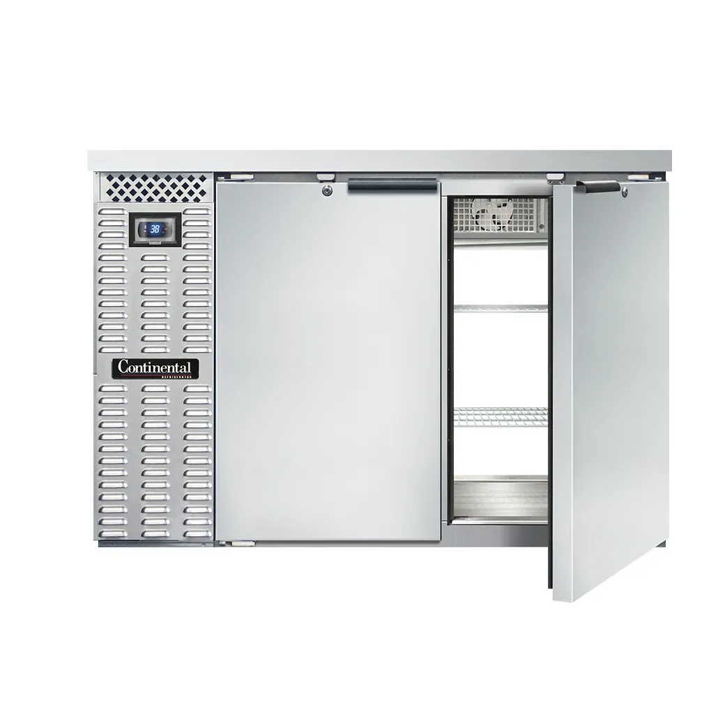 Boost your restaurant's performance with the Continental Refrigerator BB50SNSSPT Back Bar Cabinet. This refrigerated pass-thru unit is designed to optimize your restaurant's efficiency and functionality. With a shallow depth of 50"W and a height of 34-3/4"H, this unit provides ample storage space without taking up too much valuable floor space. The four doors, equipped with locks, allow for easy access and secure storage of your beverages and ingredients. The electronic controller with a digital display and hi-low alarm ensures precise temperature control and alerts you to any fluctuations. The stainless steel exterior not only adds a sleek and professional look to your establishment but also ensures durability and easy cleaning. The galvanized interior with a reinforced stainless steel floor and epoxy coated steel shelves provides a hygienic and sturdy storage solution. With self-contained refrigeration and a 1/3 HP compressor, this unit is energy-efficient and reliable. Made in the USA and certified by cETLus and NSF, you can trust the quality and safety of this back bar cabinet. Upgrade your restaurant's refrigeration system with the Continental Refrigerator BB50SNSSPT and experience enhanced performance and efficiency.