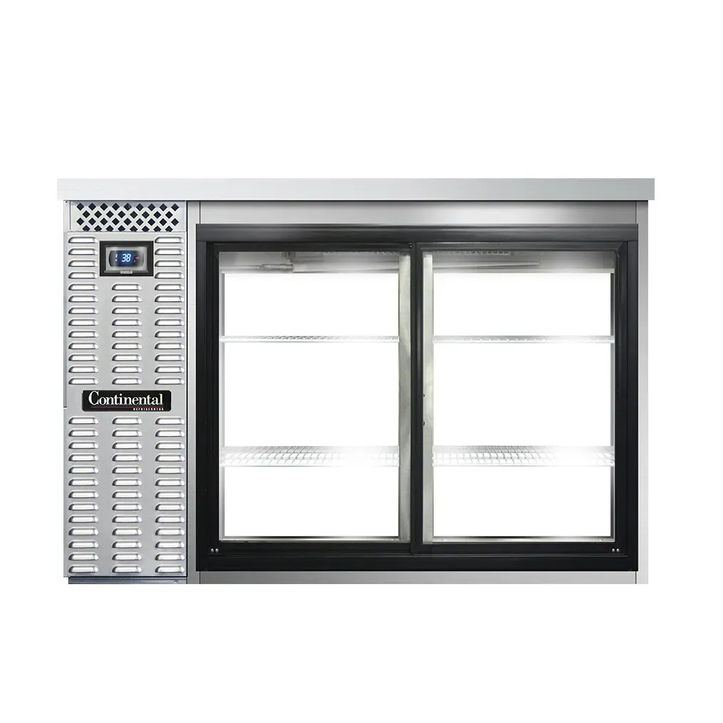 Cooking at its finest begins with the Continental Refrigerator BB50SNSSSGDPT Back Bar Cabinet. This refrigerated pass-thru unit is designed to meet the demands of a commercial restaurant, offering both functionality and style. With a shallow depth of 50"W and a height of 34-3/4"H, this unit provides ample storage space without taking up too much room in your kitchen. The sliding glass doors not only allow for easy access to your beverages and ingredients but also add a touch of elegance to your establishment. The electronic controller with a digital display and hi-low alarm ensures precise temperature control, keeping your products fresh and safe. Made in the USA, this back bar cabinet features a stainless steel exterior and a galvanized interior with a reinforced stainless steel floor, making it durable and easy to clean. The epoxy coated steel shelves provide sturdy support for your items, while the self-contained refrigeration system with a 1/3 HP compressor ensures efficient cooling. Whether you're running a bar, restaurant, or catering service, the Continental Refrigerator BB50SNSSSGDPT is the perfect addition to your commercial kitchen.