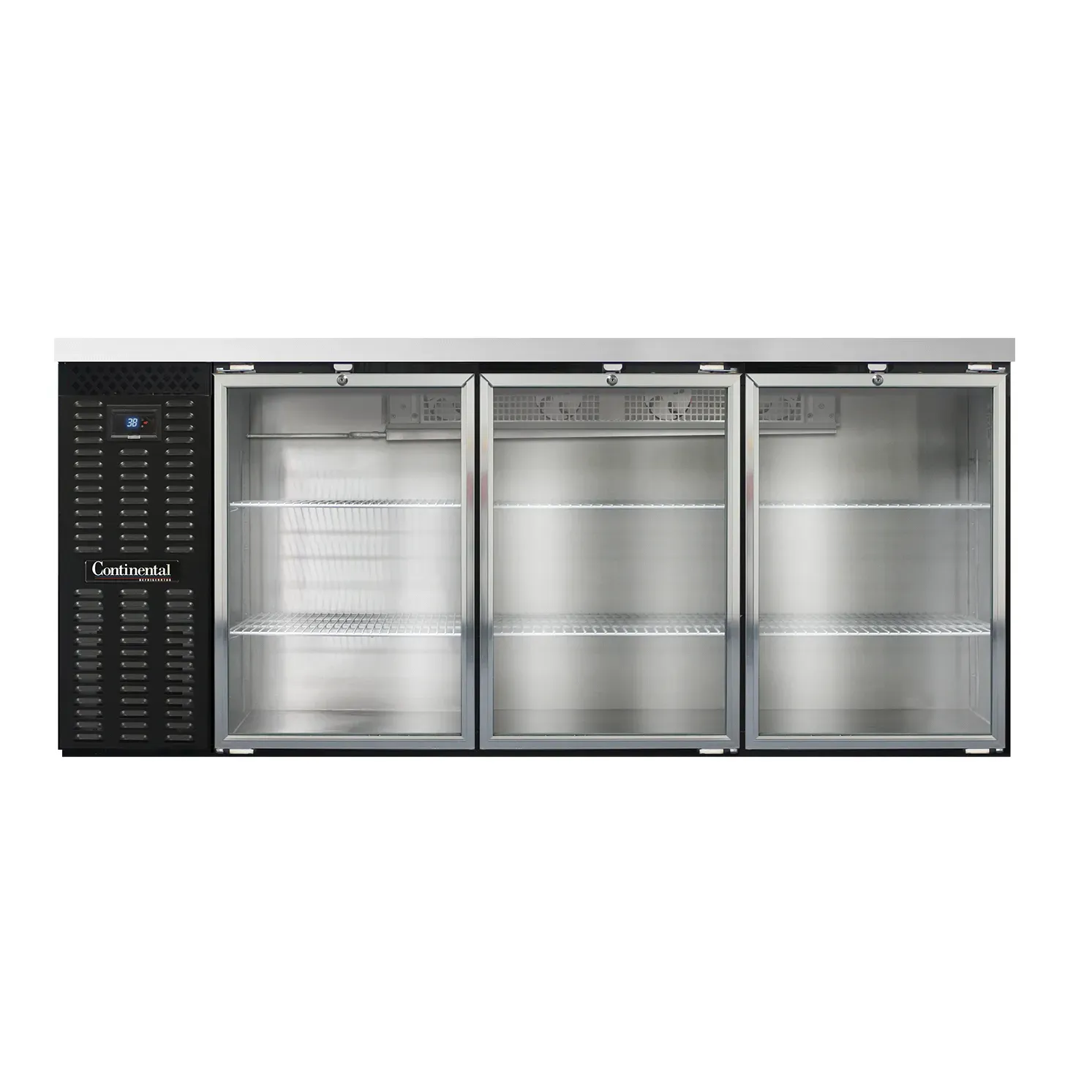 Kitchen innovation at its best, the Continental Refrigerator BB79NGD Back Bar Cabinet is a must-have for any commercial restaurant. With its sleek stainless steel top and black enamel finish exterior, this refrigerated back bar cooler not only looks stylish but also delivers exceptional performance. The unit features three glass doors with locks, allowing you to showcase your beverages while keeping them secure. The electronic controller with a digital display and hi-low alarm ensures precise temperature control and alerts you if there are any fluctuations. Inside, the galvanized interior with a reinforced stainless steel floor provides durability and easy cleaning. The epoxy coated steel shelves offer ample storage space for your drinks. Made in the USA, this self-contained refrigeration unit is NSF and cETLus certified, guaranteeing its quality and safety. Upgrade your restaurant's beverage service with the Continental Refrigerator BB79NGD Back Bar Cabinet.