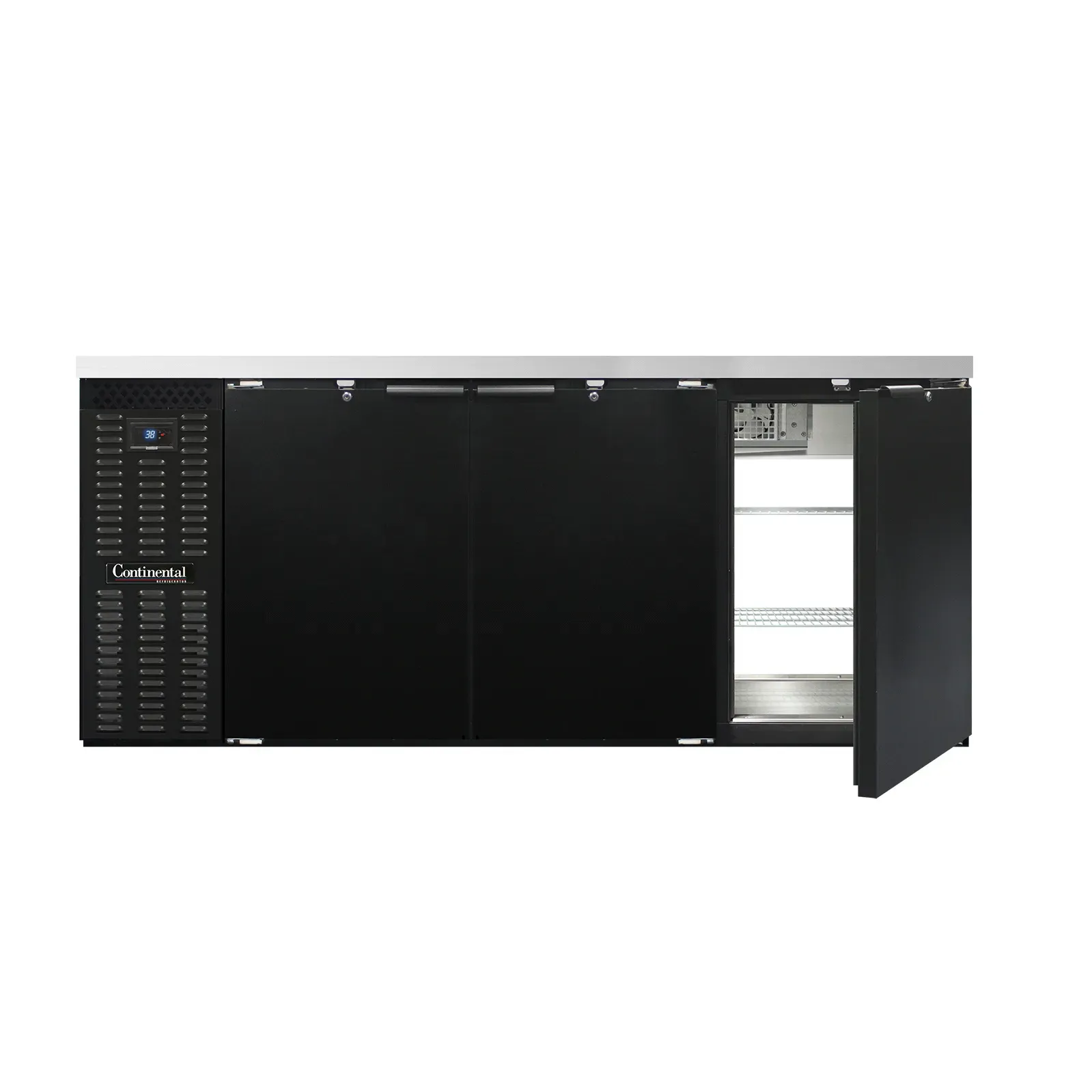 Cook with precision using the Continental Refrigerator BB79SNPT Back Bar Cabinet. This refrigerated pass-thru unit is designed to meet the demands of a commercial restaurant, offering a spacious 22.0 cu. ft. capacity and a shallow depth of 25". With its front breathing feature, this cabinet can be conveniently placed against a wall or built into a bar setup. The stainless steel top provides durability and a sleek appearance, while the six doors with locks ensure the security of your valuable ingredients and beverages. The electronic controller with a digital display and hi-low alarm allows for precise temperature control and monitoring. The black enamel finish exterior adds a touch of elegance to any restaurant decor, while the galvanized interior with a reinforced stainless steel floor and epoxy coated steel shelves ensures easy cleaning and maintenance. Made in the USA and certified by cETLus and NSF, this Continental Refrigerator Back Bar Cabinet is a reliable and efficient choice for your commercial kitchen.