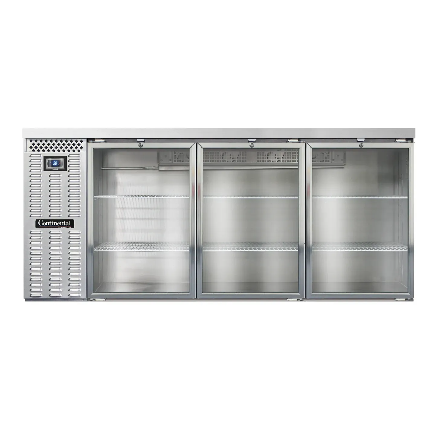 Empower your kitchen staff with the Continental Refrigerator BB79SNSSGD Back Bar Cabinet. This refrigerated unit is designed specifically for commercial restaurant use, offering a spacious 22.0 cubic feet of storage capacity. With its shallow depth of 23", it can easily fit into tight spaces without compromising on functionality. The three glass doors, equipped with locks, provide easy access to your beverages while ensuring their security. The electronic controller with a digital display and hi-low alarm allows for precise temperature control and monitoring. The stainless steel exterior not only adds a sleek and professional look to your establishment but also ensures durability and easy cleaning. Inside, the galvanized interior with a reinforced stainless steel floor and epoxy coated steel shelves provide a sturdy and hygienic storage solution. With self-contained refrigeration and a 1/3 HP compressor, this back bar cabinet is both energy-efficient and reliable. Trust Continental Refrigerator for quality and performance in your commercial kitchen.