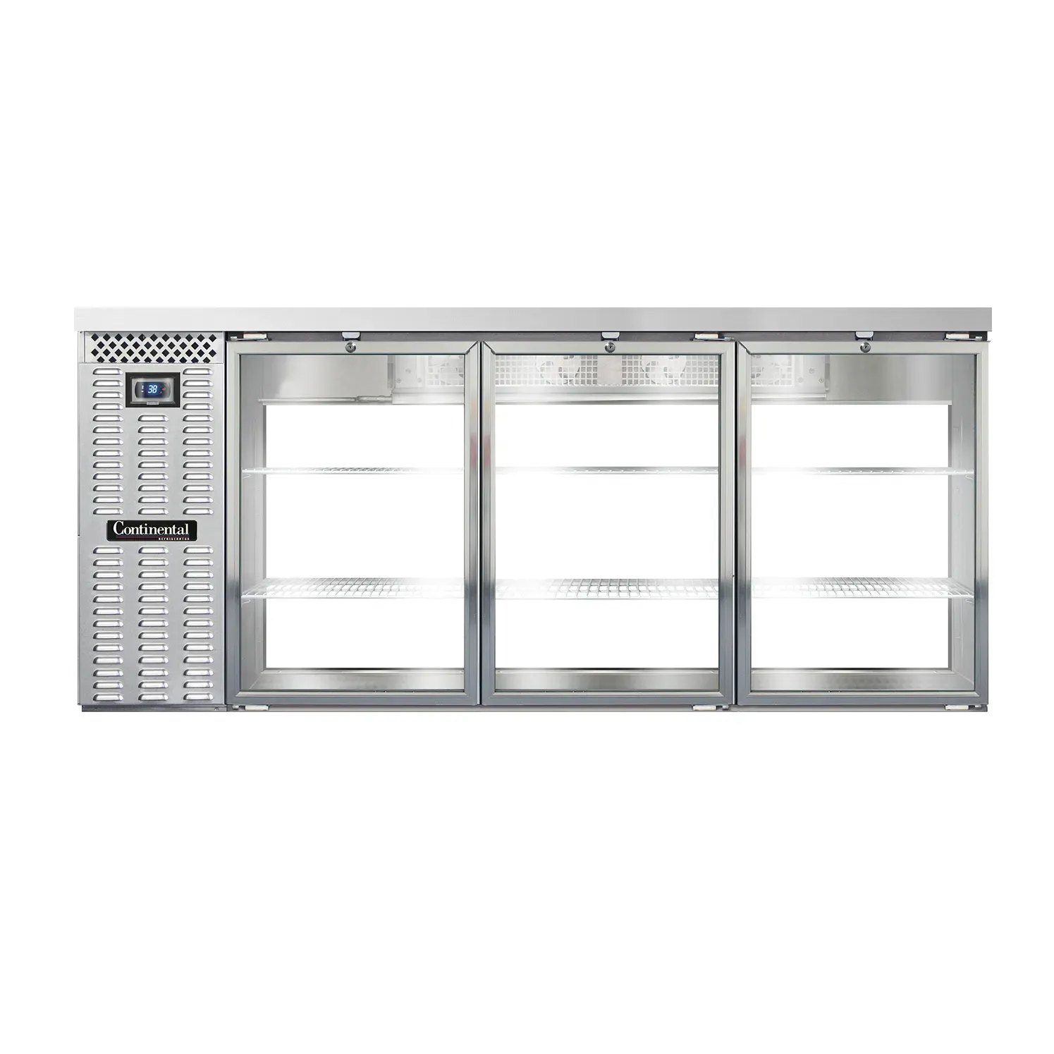 Unleash gastronomic brilliance with the Continental Refrigerator BB79SNSSGDPT Back Bar Cabinet. This refrigerated pass-thru unit is a must-have for any commercial restaurant looking to optimize their storage and display capabilities. With its shallow depth design and 79" width, this cabinet offers a spacious 22.0 cubic feet of storage space, perfect for keeping beverages and ingredients chilled and easily accessible. The front breathing feature ensures efficient airflow, while the stainless steel top provides a durable and sleek surface. The six glass doors, equipped with locks, allow for convenient visibility and security. The electronic controller with a digital display and hi-low alarm ensures precise temperature control and monitoring. Made in the USA, this unit is built to last with a galvanized interior, reinforced stainless steel floor, and epoxy coated steel shelves. With its self-contained refrigeration and 1/3 HP compressor, this back bar cabinet is both reliable and energy-efficient. Elevate your restaurant's functionality and style with the Continental Refrigerator BB79SNSSGDPT Back Bar Cabinet.