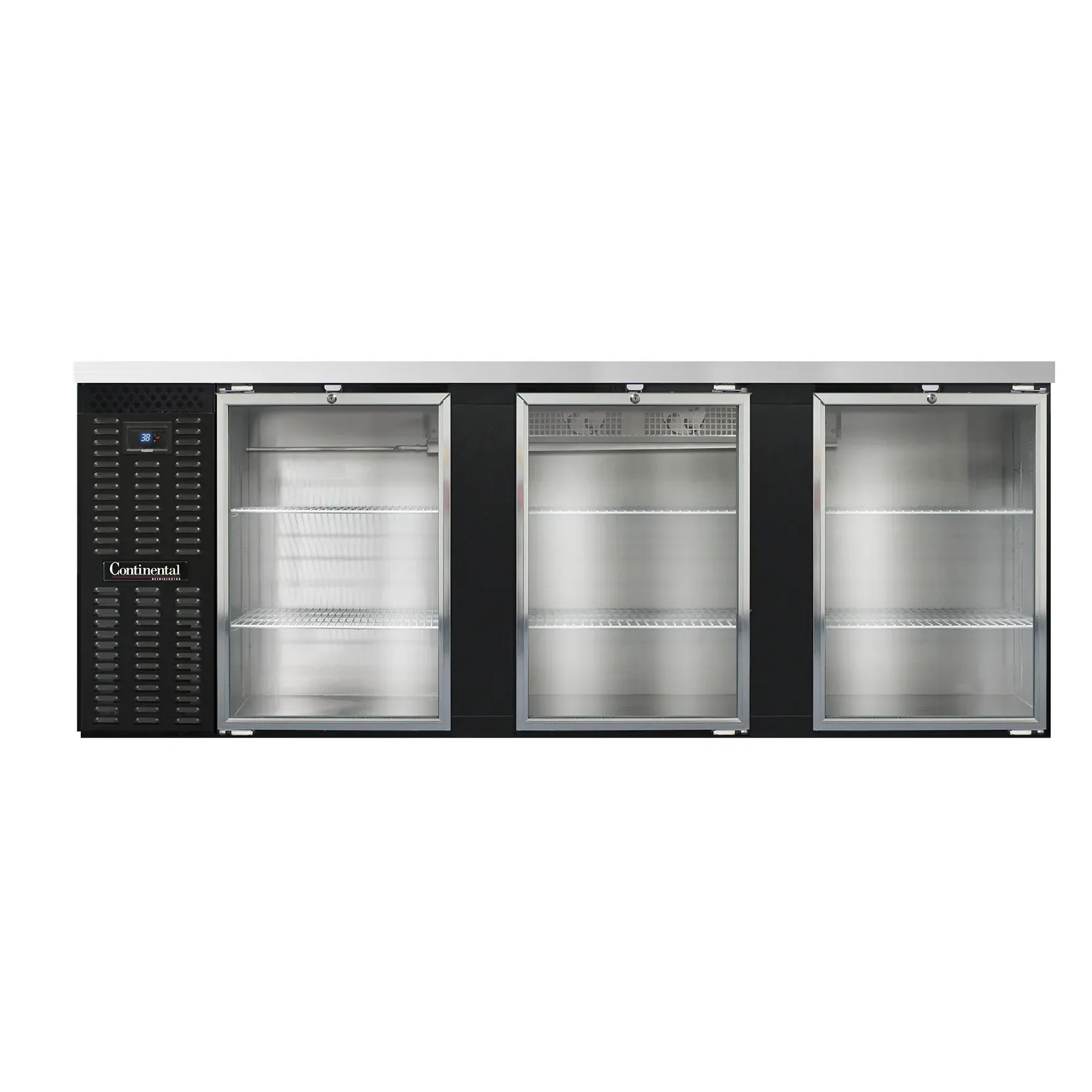 Fuel your passion for cooking with the Continental Refrigerator BBN90GD Back Bar Cabinet. This refrigerated unit is designed to meet the needs of commercial restaurants, offering a spacious 35.0 cubic feet of storage space. With its front breathing system, stainless steel top, and three glass doors with locks, this back bar cooler combines functionality and security. The electronic controller with a digital display and hi-low alarm ensures precise temperature control and monitoring, allowing you to keep your beverages and ingredients at the perfect temperature. The black enamel finish exterior adds a sleek and professional look to any restaurant setting, while the galvanized interior with a reinforced stainless steel floor ensures durability and easy cleaning. The epoxy coated steel shelves provide ample storage for bottles, cans, and other items. Made in the USA and certified by cETLus and NSF, the Continental Refrigerator BBN90GD is a reliable and high-quality addition to any commercial kitchen.