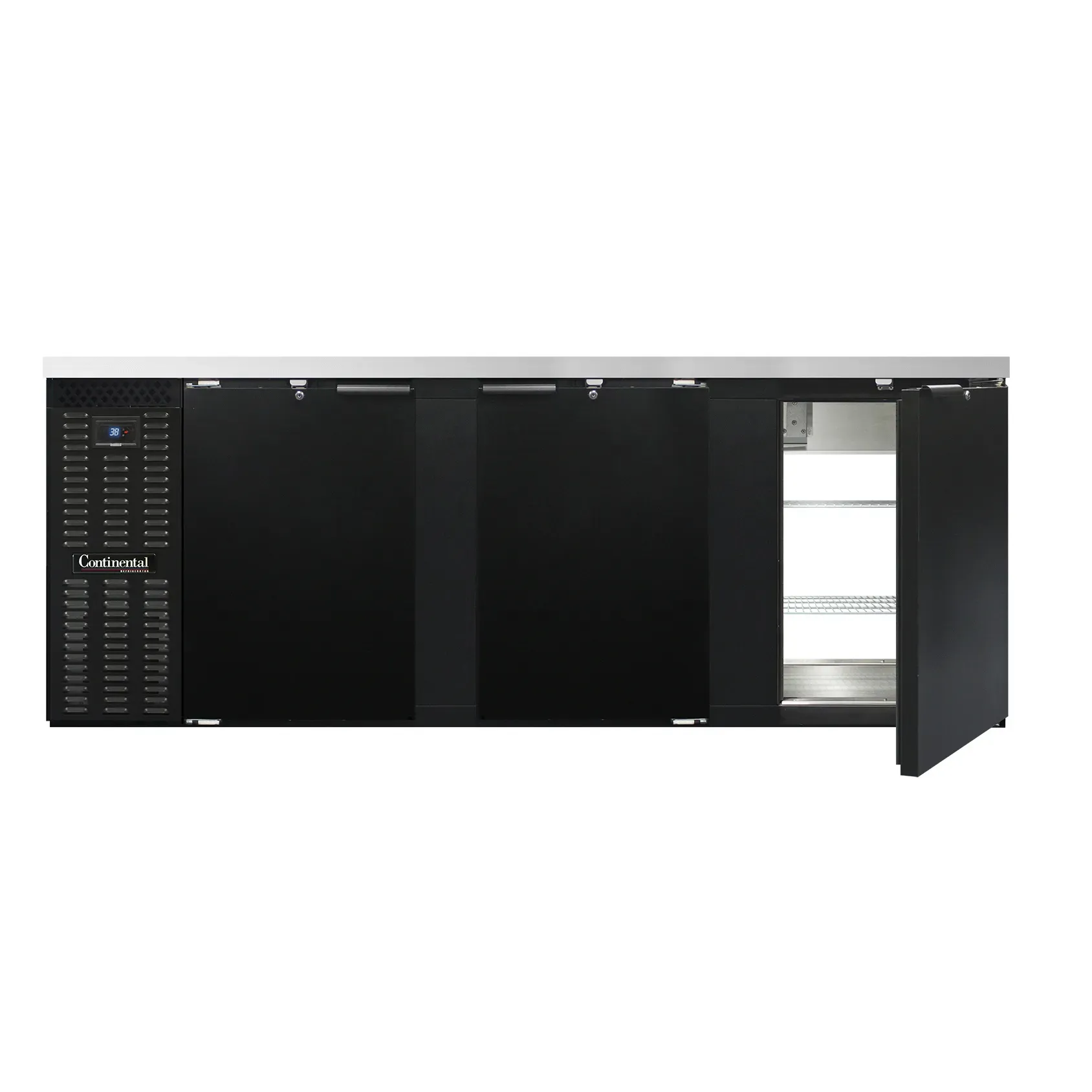 Deliver food perfection with the Continental Refrigerator BB90NPT Back Bar Cabinet. This refrigerated pass-thru unit is a must-have for any commercial restaurant. With its spacious 35.0 cu. ft. capacity and six doors with locks, you can easily store and access a wide variety of beverages and ingredients. The front breathing design and stainless steel top ensure durability and easy maintenance. The electronic controller with a digital display and hi-low alarm allows for precise temperature control, ensuring your food and drinks stay fresh and at the perfect temperature. The black enamel finish exterior adds a sleek and professional look to your establishment, while the galvanized interior with a reinforced stainless steel floor and epoxy coated steel shelves provide durability and easy cleaning. Made in the USA and certified by cETLus and NSF, this back bar cabinet is a reliable and high-quality addition to your restaurant.