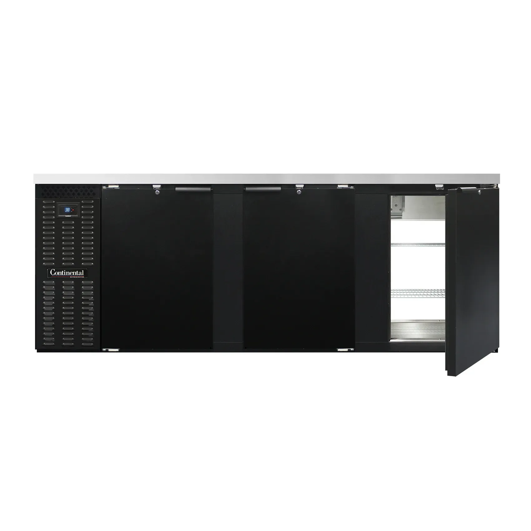 Master your restaurant's kitchen with the Continental Refrigerator BB90SNPT Back Bar Cabinet. This refrigerated pass-thru unit is designed to optimize your restaurant's efficiency and productivity. With a shallow depth of 25 inches, this cabinet is perfect for tight spaces while still providing ample storage with its 25.0 cu. ft. capacity. The six doors, equipped with locks, allow for easy access and secure storage of your beverages and ingredients. The electronic controller with a digital display and hi-low alarm ensures precise temperature control and monitoring. The stainless steel top and black enamel finish exterior not only give this cabinet a sleek and professional look but also make it durable and easy to clean. The galvanized interior with a reinforced stainless steel floor and epoxy coated steel shelves further enhance its durability. Made in the USA, this Continental Refrigerator Back Bar Cabinet is cETLus and NSF certified, guaranteeing its quality and safety. Upgrade your restaurant's kitchen with this reliable and efficient refrigerated pass-thru cabinet.