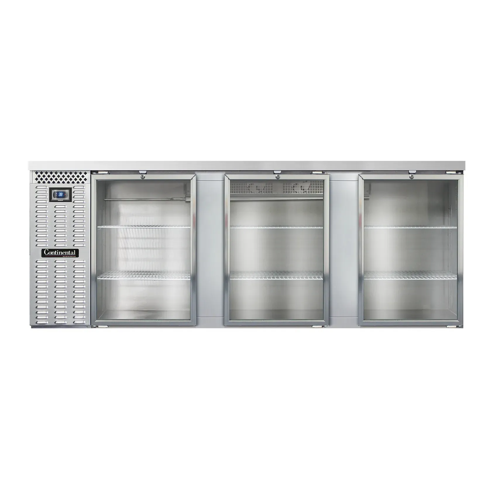 Equip your kitchen for success with the Continental Refrigerator BB90SNSSGD Back Bar Cabinet. This refrigerated unit is designed to meet the demands of a commercial restaurant, ensuring that your beverages are kept at the perfect temperature. With a shallow depth of 23", this cabinet maximizes space efficiency without compromising on storage capacity. The three glass doors, equipped with locks, allow for easy visibility and access to your drinks while keeping them secure. The electronic controller with a digital display and hi-low alarm ensures precise temperature control and alerts you if there are any fluctuations. The stainless steel exterior and galvanized interior with a reinforced stainless steel floor make this cabinet durable and easy to clean. The epoxy coated steel shelves provide sturdy storage for your bottles and cans. With its self-contained refrigeration system and 1/2 HP compressor, this cabinet is both energy-efficient and powerful. Trust Continental Refrigerator, a reputable brand known for its quality and reliability. Upgrade your bar with the Continental Refrigerator BB90SNSSGD Back Bar Cabinet.
