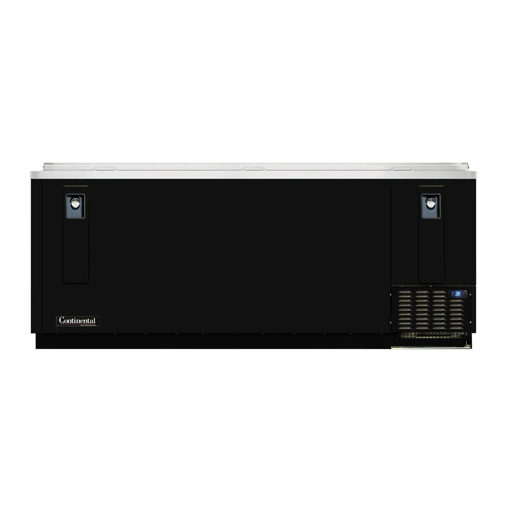 Cook with confidence and flair with the Continental Refrigerator CBC95 Bottle Cooler. This top-of-the-line bottle cooler is designed to meet the needs of commercial restaurants, ensuring that your beverages are kept at the perfect temperature for your customers' enjoyment. With a spacious 95" width, this cooler can hold up to 40 cases of 12 oz bottles or 59 cases of 12 oz cans, providing ample storage space for your drink selection. The stainless steel top with three slide back lids not only adds a sleek and professional look to your establishment but also allows for easy access to your beverages. The textured baked black enamel exterior is not only visually appealing but also durable and easy to clean. The galvanized interior ensures the longevity of the cooler, while the electronic controller with a digital display and hi-low alarm allows for precise temperature control and monitoring. The removable cap catcher makes it convenient to keep your space clean and tidy. With self-contained refrigeration and a 1/2 HP compressor, this bottle cooler is energy-efficient and reliable. Made in the USA, this Continental Refrigerator CBC95 Bottle Cooler is cETLus and NSF certified, guaranteeing its quality and safety. Upgrade your restaurant's beverage service with this high-performance bottle cooler.