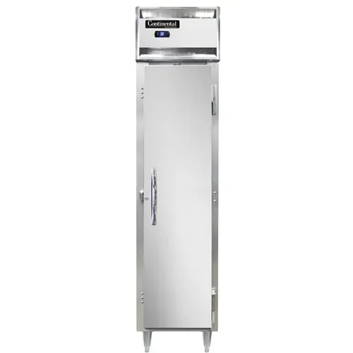Revolutionize your cooking setup with the Continental Refrigerator D1RSENSA* Reach-In Refrigerator. This designer slim line refrigerator is perfect for commercial restaurant use, offering a narrow full-height solid door and a standard depth cabinet. The stainless steel exterior and aluminum interior ensure durability and easy cleaning, while the self-contained refrigeration system keeps your ingredients fresh and at the perfect temperature. With electronic control and a digital display, you can easily monitor and adjust the settings to meet your specific needs. The hi-low alarm alerts you if the temperature deviates from the desired range, ensuring the safety of your food. The 6" stainless steel legs provide stability and make it easy to clean underneath the refrigerator. Made in the USA and certified by cETLus and NSF, this Continental Refrigerator is a reliable and efficient choice for any commercial kitchen. Upgrade your restaurant's refrigeration system today with the Continental Refrigerator D1RSENSA* Reach-In Refrigerator.