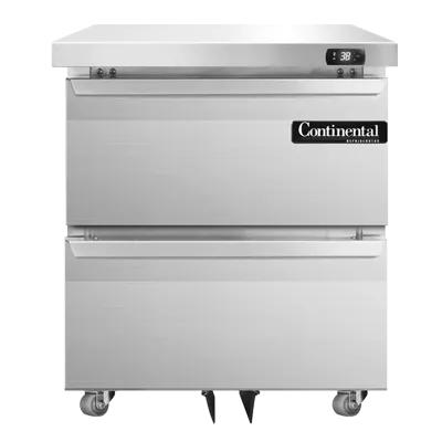 Revolutionize your cooking setup with the Continental Refrigerator D27N-U-D Undercounter Reach-In Refrigerator. This designer line refrigerator is perfect for commercial restaurant use, offering a compact yet spacious solution for storing your ingredients. With its stainless steel exterior and interior, this refrigerator not only looks sleek but is also durable and easy to clean. The two drawers can accommodate one 12 x 20 x 6 pan each, allowing for efficient organization and easy access to your ingredients. The front breathing design and rear mounted self-contained refrigeration ensure optimal performance and temperature control. The electronic control with a digital display and hi-low alarm provide convenience and peace of mind. Made in the USA and cETLus certified, this Continental Refrigerator is a reliable and high-quality addition to any commercial kitchen. Upgrade your restaurant's refrigeration capabilities with the D27N-U-D Undercounter Reach-In Refrigerator.
