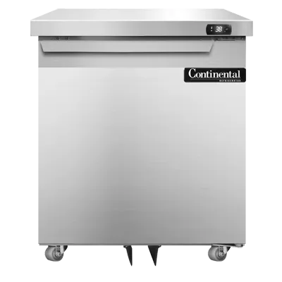 Discover kitchen perfection with the Continental Refrigerator D27N-U Undercounter Reach-In Refrigerator. This designer line refrigerator is a must-have for any commercial restaurant. With its sleek stainless steel exterior and interior, it not only adds a touch of elegance to your kitchen but also ensures durability and easy cleaning. The 27" width and one-section design provide ample storage space for all your ingredients and beverages. The field rehingeable door allows for easy access and customization to fit your kitchen layout. Equipped with front breathing and rear-mounted self-contained refrigeration, this refrigerator ensures efficient cooling and temperature control. The electronic control with a digital display and hi-low alarm further enhances convenience and food safety. With a 1/5 hp compressor, this refrigerator is powerful enough to meet the demands of a busy restaurant. Made in the USA and cETLus certified, the Continental Refrigerator D27N-U is a reliable and high-quality addition to your commercial kitchen.