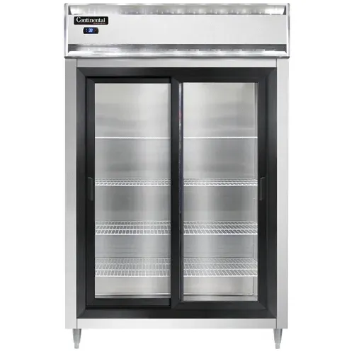 Dominate the culinary world with the Continental Refrigerator D2RSNSGD Reach-In Refrigerator. This designer line refrigerator is perfect for commercial restaurant use, offering a sleek and modern design that will enhance any kitchen. The shallow depth cabinet and full-height sliding glass doors provide easy access to your ingredients, while the aluminum exterior and interior ensure durability and easy cleaning. The stainless steel front adds a touch of elegance and is resistant to corrosion. With electronic control and a digital display, you can easily monitor and adjust the temperature to keep your food fresh and safe. The hi-low alarm alerts you if the temperature goes outside the desired range, preventing spoilage. The 6" stainless steel legs provide stability and make it easy to clean underneath the refrigerator. With a powerful 1/2 HP compressor, this reach-in refrigerator is capable of handling the demands of a busy commercial kitchen. Trust Continental Refrigerator for reliable and high-quality refrigeration solutions.