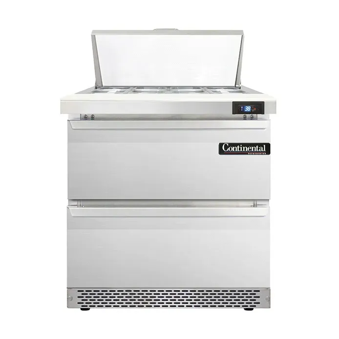 Create culinary magic with the Continental Refrigerator D32N8-FB-D Refrigerated Counter, Sandwich / Salad Unit. This designer line sandwich unit is perfect for commercial restaurant use, offering both functionality and style. With its front breather and stainless steel construction, this unit is built to withstand the demands of a busy kitchen. The 32" wide unit features a spacious one-section design, complete with eight 1/6 size pans and a 12" cutting board for easy food preparation. The two drawers provide additional storage space, accommodating either a 12 x 20 x 6 pan or a combination of a 1/2 x 6 pan and two 1/3 x 6 pans per drawer. The electronic control with digital display and hi-low alarm ensure precise temperature control and food safety. With its rear-mounted self-contained refrigeration and 1/5 hp compressor, this unit is both efficient and reliable. Made in the USA and certified by cETLus and NSF, the Continental Refrigerator D32N8-FB-D is the perfect addition to any commercial kitchen.