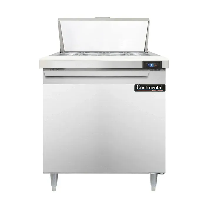 Enhance the heart of your restaurant with the Continental Refrigerator D32N8 Refrigerated Counter, Sandwich / Salad Unit. This designer line sandwich unit is perfect for commercial restaurant use, offering a spacious 32"W one-section design. It comes with eight 1/6 size x 4" deep pans and a convenient 12" cutting board, providing ample space for preparing and storing ingredients. The unit features a field rehingeable door, allowing for easy access and customization. Made with stainless steel top, front, sides, and interior, this sandwich unit is not only durable but also easy to clean. The electronic control with a digital display and hi-low alarm ensures precise temperature control and food safety. With rear-mounted self-contained refrigeration and 6" adjustable legs, this unit is both efficient and versatile. Trust Continental Refrigerator for quality and reliability in your commercial kitchen.