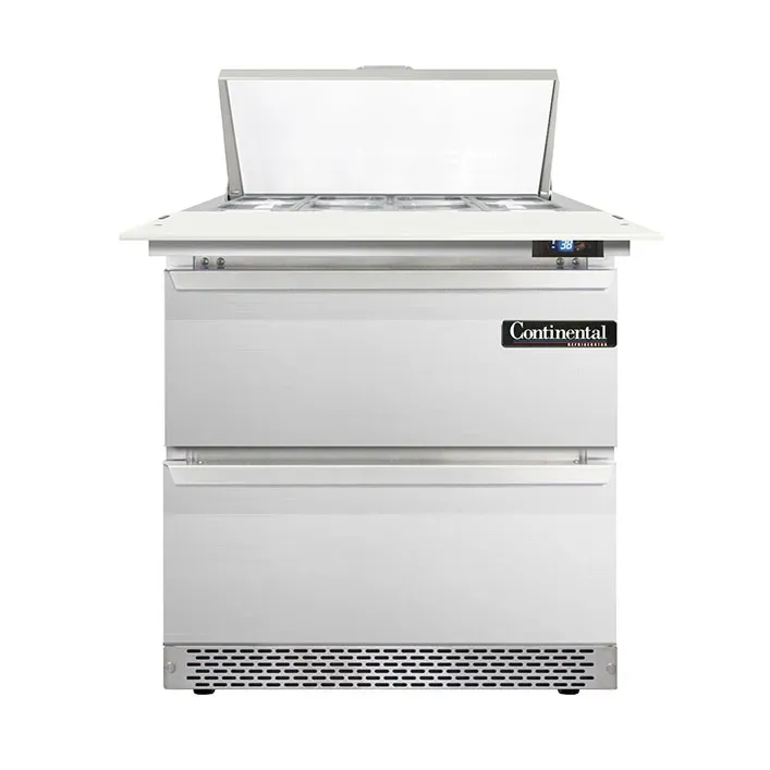 Kitchen innovation at its best, the Continental Refrigerator D32N8C-FB-D Refrigerated Counter is a must-have for any commercial restaurant. This designer line sandwich unit is designed to meet the demands of a busy kitchen, offering both functionality and style. With its front breather and stainless steel construction, this unit is built to withstand the rigors of a commercial kitchen while maintaining a sleek and professional appearance. The unit features a spacious 32" width, perfect for accommodating a variety of ingredients and food items. It comes with eight 1/6 size pans with a 4" depth, along with a convenient 19" cutting board for easy food preparation. The two drawers provide additional storage space and can accommodate either a 12 x 20 x 6 pan or a 1/2 x 6 pan and two 1/3 x 6 pans per drawer. The electronic control with a digital display allows for precise temperature management, while the hi-low alarm ensures food safety. With its rear-mounted self-contained refrigeration and 1/5 hp compressor, this unit offers efficient cooling and reliable performance. The Continental Refrigerator D32N8C-FB-D Refrigerated Counter is NSF certified and proudly made in the USA, guaranteeing its quality and durability. Upgrade your kitchen with this top-of-the-line sandwich/salad unit and experience the convenience and efficiency it brings to your restaurant operations.