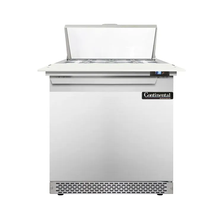 Revolutionize your cooking setup with the Continental Refrigerator D32N8C-FB Refrigerated Counter, Sandwich / Salad Unit. This designer line sandwich unit is perfect for commercial restaurant use, offering a sleek and efficient solution for your food preparation needs. With its front breather design, this unit can easily fit into any kitchen layout. The unit features a spacious 32" width, allowing for ample storage and organization of ingredients. It comes with eight 1/6 size pans, each 4" deep, along with a 19" cutting board for convenient food prep. The stainless steel construction of the top, front, sides, and interior ensures durability and easy cleaning. The electronic control with a digital display and hi-low alarm provides precise temperature management and monitoring. With rear-mounted self-contained refrigeration and 3-3/4" casters, this unit is both mobile and efficient. Trust in the Continental Refrigerator D32N8C-FB to enhance your restaurant's productivity and efficiency.