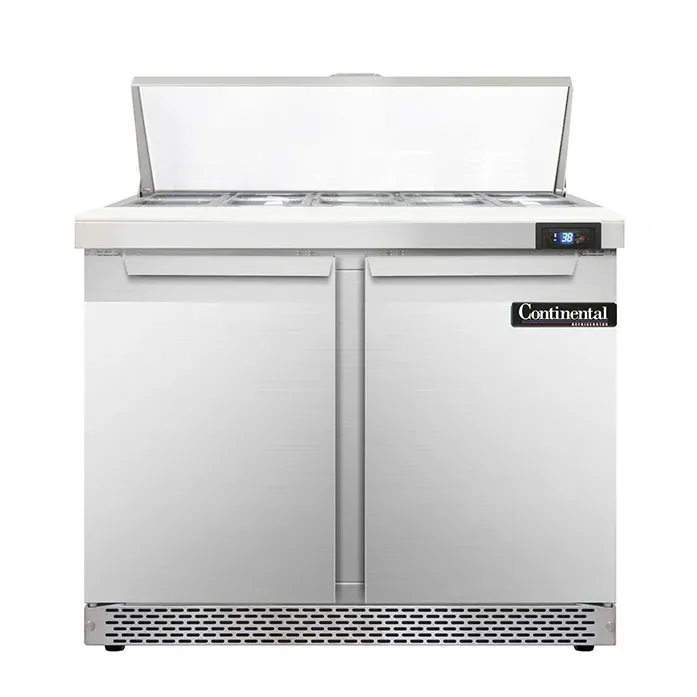 Realize kitchen dreams with the Continental Refrigerator D36N10-FB Refrigerated Counter, Sandwich / Salad Unit. This designer line sandwich unit is perfect for commercial restaurant use, offering both functionality and style. With its front breather and rear mounted self-contained refrigeration, this unit ensures efficient cooling while maintaining a sleek appearance. The unit features a spacious 36" width, two-section design, and comes with (10) 1/6 size x 4" deep pans with a 12" cutting board, providing ample space for sandwich and salad preparation. The stainless steel top, front, sides, and interior not only enhance durability but also make cleaning a breeze. The electronic control with a digital display and hi-low alarm allows for precise temperature management, ensuring food safety. With its 3-3/4" casters, this unit is easy to move and position in any kitchen layout. Made in the USA and certified by cETLus and NSF, the Continental Refrigerator D36N10-FB is a reliable and high-quality addition to any commercial kitchen.