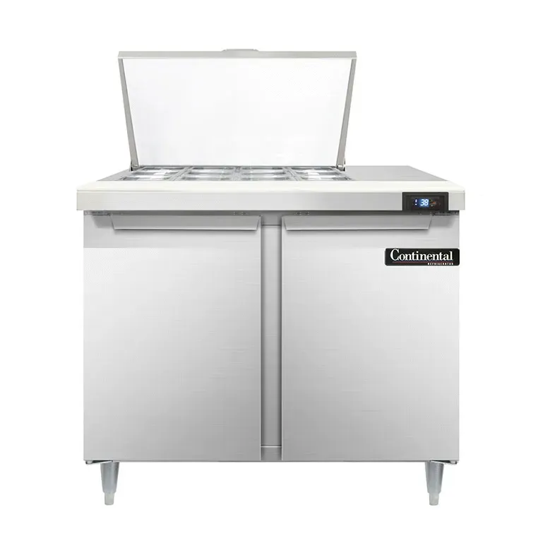 Empower your kitchen staff with the Continental Refrigerator D36N12M Refrigerated Counter, Mega Top Sandwich / Salad Unit. This designer line mighty top sandwich unit is perfect for commercial restaurant use. With its spacious 36" width and two-section design, it offers ample storage and organization for your ingredients. The unit comes with twelve 1/6 size pans, each 4" deep, and a convenient 10" cutting board for easy food preparation. The stainless steel top, front, sides, and interior ensure durability and easy cleaning. The electronic control with a digital display allows for precise temperature management, while the hi-low alarm ensures food safety. The rear-mounted self-contained refrigeration system, powered by a 1/5 hp motor, keeps your ingredients fresh and cool. With adjustable legs for stability and a field rehingeable door for convenience, this refrigerated counter is a must-have for any commercial kitchen.
