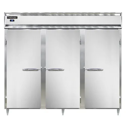 Introducing the Continental Refrigerator D3RENSS Reach-In Refrigerator, designed to simplify restaurant operations. This wide three-section refrigerator is part of the Designer Line, offering a sleek and professional look for your commercial kitchen. With an 85-1/5" width and full-height stainless steel doors, this refrigerator provides ample storage space for your ingredients and beverages. The self-contained refrigeration system ensures optimal temperature control, while the stainless steel exterior and interior make it durable and easy to clean. The electronic control with a digital display allows for precise temperature adjustments, and the hi-low alarm alerts you if the temperature deviates from the set range. Equipped with 6" stainless steel legs, this refrigerator is stable and easy to move for cleaning purposes. With its 1/2 HP motor, cETLus and NSF certifications, and Made in USA label, the Continental Refrigerator D3RENSS is a reliable and high-quality choice for any commercial restaurant.