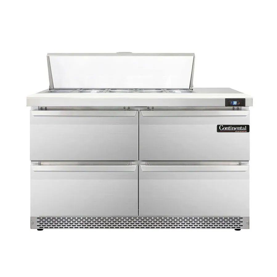 Achieve kitchen supremacy with the Continental Refrigerator D48N10-FB-D Refrigerated Counter, Sandwich / Salad Unit. This designer line sandwich unit is a must-have for any commercial restaurant. With its front breather and stainless steel construction, it not only looks sleek but also ensures durability and easy cleaning. The unit features a spacious 48" width, two sections, and comes with ten 1/6 size pans with a 4" depth, along with a convenient 12" cutting board. The four drawers provide ample storage space and can accommodate various pan sizes. The electronic control with a digital display allows for precise temperature management, while the hi-low alarm ensures food safety. The rear-mounted self-contained refrigeration system with a 1/5 hp compressor guarantees efficient cooling. With its NSF and cETLus certifications, this sandwich/salad unit is a reliable and high-quality addition to any commercial kitchen. Made in the USA by Continental Refrigerator, this unit is built to last and deliver exceptional performance.