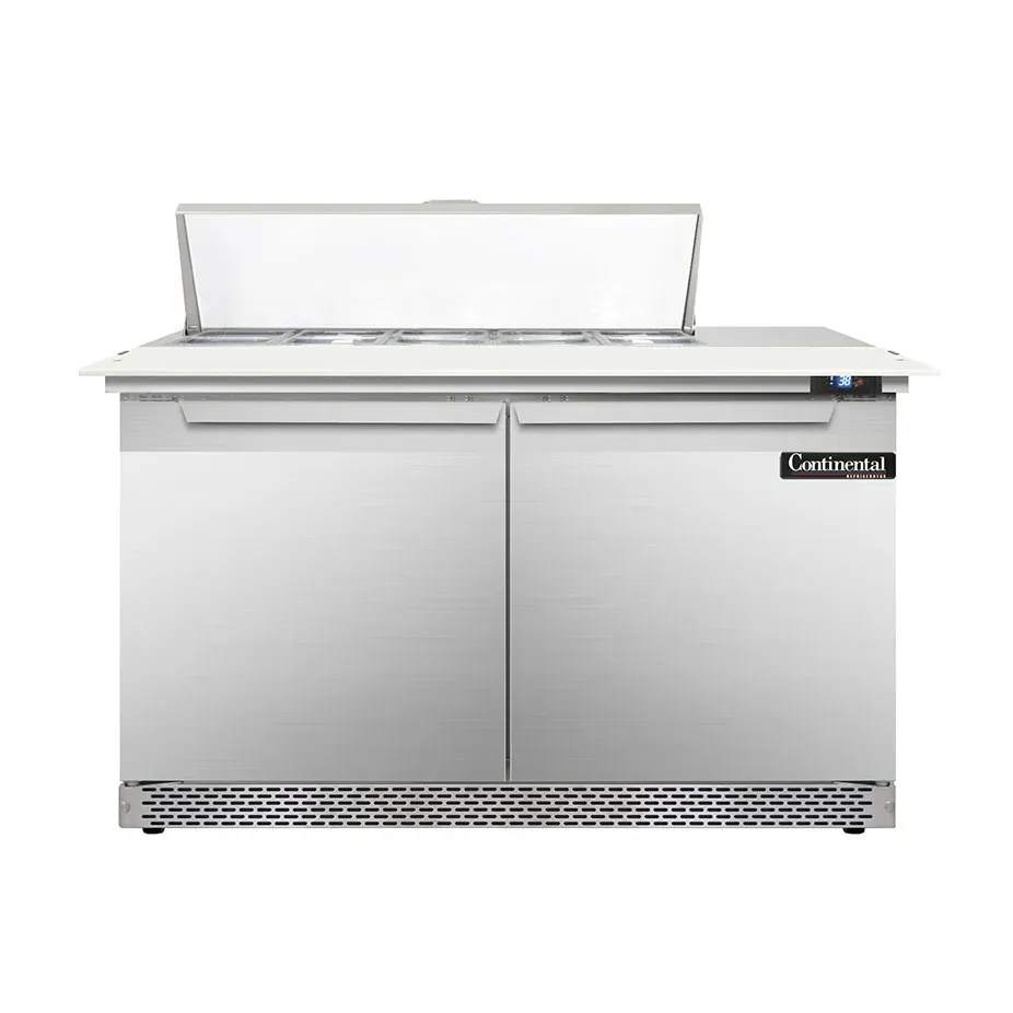 Optimize your kitchen efficiency with the Continental Refrigerator D48N10C-FB Refrigerated Counter, Sandwich / Salad Unit. This designer line sandwich unit is perfect for commercial restaurant use, offering a spacious 48"W two-section design. It comes with (10) 1/6 size x 4" deep pans and a convenient 19" cutting board, allowing you to easily prepare and assemble sandwiches and salads. The unit features two field rehingeable doors, ensuring easy access to your ingredients. Made in the USA, this sandwich unit is built to last with its stainless steel top, front, sides, and interior. The electronic control with a digital display and hi-low alarm allows for precise temperature management, ensuring your ingredients stay fresh. With rear-mounted self-contained refrigeration and 3-3/4" casters, this unit is both convenient and mobile. Trust Continental Refrigerator for reliable and efficient refrigeration solutions in your commercial kitchen.
