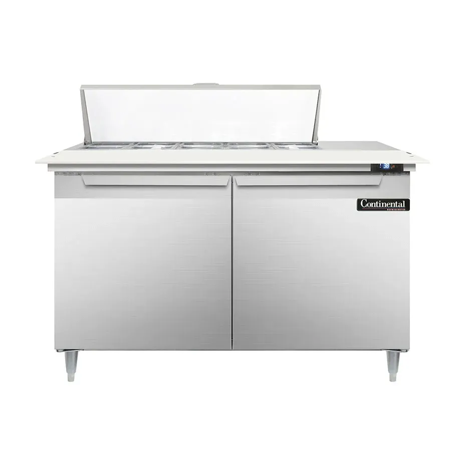 Craft culinary wonders with the Continental Refrigerator D48N10C Refrigerated Counter, Sandwich / Salad Unit. This designer line sandwich unit is perfect for commercial restaurant use, offering a spacious 48"W two-section design. It comes with (10) 1/6 size x 4" deep pans and a convenient 19" cutting board, allowing you to easily prepare and assemble a variety of sandwiches and salads. The unit features two field rehingeable doors, ensuring easy access to your ingredients. Made in the USA, this sandwich unit boasts a durable stainless steel top, front, sides, and interior, guaranteeing longevity and easy cleaning. The electronic control with a digital display and hi-low alarm provides precise temperature management, while the rear-mounted self-contained refrigeration system ensures optimal cooling performance. With 6" adjustable legs, this unit can be easily positioned to suit your kitchen layout. Trust Continental Refrigerator for reliable, high-quality refrigeration solutions that enhance your culinary creations.