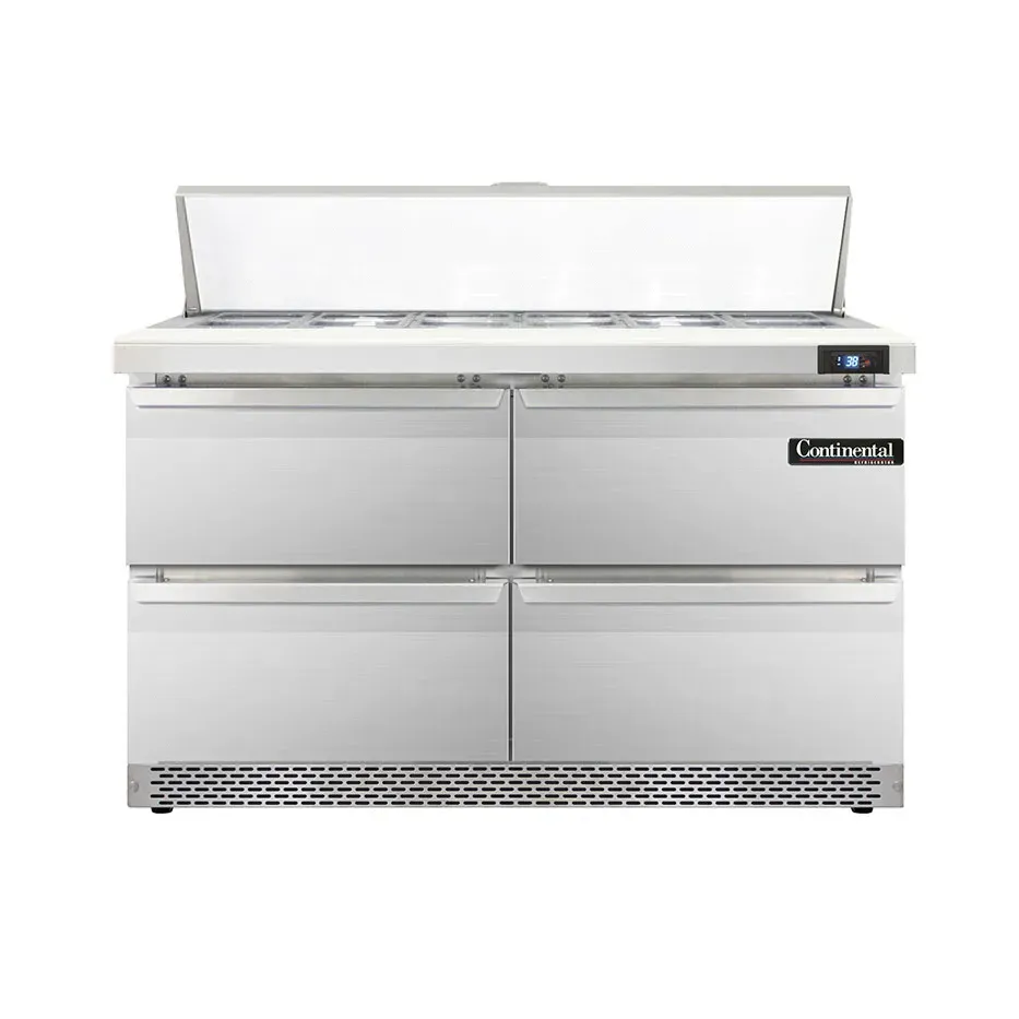 Unleash gastronomic brilliance with the Continental Refrigerator D48N12-FB-D Refrigerated Counter, Sandwich / Salad Unit. This designer line sandwich unit is perfect for commercial restaurant use, offering both functionality and style. With its front breather design, this unit ensures efficient cooling while maintaining a sleek appearance. The unit features a spacious 48" width, two sections, and comes with twelve 1/6 size pans with a 4" depth, accompanied by a convenient 12" cutting board. Additionally, it includes four drawers that can accommodate various pan sizes, providing versatility in food storage. The stainless steel construction of the top, front, sides, and interior ensures durability and easy cleaning. Equipped with electronic control and a digital display, this unit allows for precise temperature management. The hi-low alarm feature ensures food safety by alerting staff of any temperature fluctuations. With its rear-mounted self-contained refrigeration and 1/5 hp compressor, this unit delivers reliable performance. Made in the USA and certified by cETLus and NSF, the Continental Refrigerator D48N12-FB-D is a top choice for any commercial kitchen.